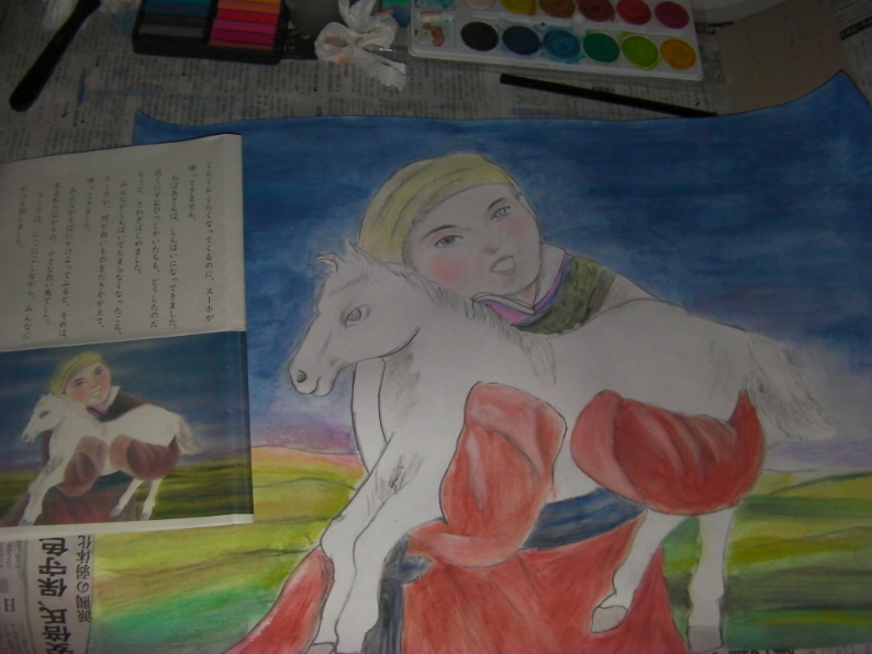 只今お絵描き中 音楽日記 2012年10月01日 小学校のボランティアで、教科書の挿し絵を拡大して画用紙に描くというのをしてるけれど、これは2年生の「スーホの白い馬」だよ。左が教科書のコピーで右が描いてる途中の。あと顔をはっきりさせて、服に黒で薄く影を付け、空に薄い雲を塗れば終わる予定。疲れた。まだまだ何枚もあるんだよう。早く仕上げないと授業始まっちゃう。絵の具が面倒いので、水彩色鉛筆を買ったけど、使いやすくてイイネ!100均の18色のパステルも、以外と良かった。絵の具と混ぜて使ってます。 [2回]