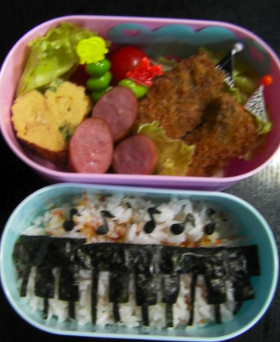 ピアノ弁当再び 食べ物系 2012年10月02日 今日は子供の弁当の日なので、いつものピアノ弁当を作りました。今回は御飯の上を前面海苔ではなく、パンチャーで海苔を音符型に抜いたのを乗せてみました。今回も、海苔が水分吸って、食べる頃には音符の原型とどめてない気がする…あと、うちの子は小食なので、御飯をきっちりつめると多すぎるので、ふわっと入れてるので、細い海苔がガタガタに型くずれするんだよね。しかもなんか殺風景、、御飯周りに漬け物かそぼろでもぐるっと巻いたら可愛くなったかな??理想はクックパッドにのってるような素敵なお弁当だけど、まだまだ修行が足りないよね。写真では見にくいけど、カツに刺さってるピックの柄は、ピアノと音符柄で、100均に売ってたものです。ところでグランドピアノ型のお弁当箱でもあれば素敵だとおもうんだけど、ピアノ柄はあっても、ピアノ型は無いのよ。誰か作らないかな。大きなお弁当箱に、ご飯をピアノ型に詰めるほうが手っ取り早いかな〜。今度挑戦してみよう!【its】「ランチタイムが待ち遠しいね!」ランチボックス YF2115価格:1,260円(2012/10/2 08:19時点)感想(0件) [3回]