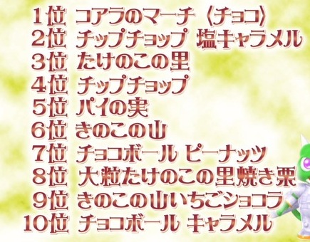 お菓子総選挙面白かった 食べ物系 2012年10月28日 昨日、車の中で時間潰すのにTVで見てた、お菓子総選挙が面白かった♪最後まで見れなかったんで、ネットで結果調べてみた。参加企業が限られてるのがちょっと、えっ?って思ったけど仕方ない。チョコでランクイン予想したら、絶対チロルチョコやろう!って思ったけど。なんで参加してくれなかったのかな。コーヒーヌガー味最高!中にチェルシーが入ってるチョコは美味しかったな。去年はコンビニで買いだめして食べたくらい好きだったけど、今年の冬も販売するのかな。チョコランキングならチロルとロッテが入ってないと不公平やろうと思った。クッキーのカントリーマアムは予想通りだった。リッツもいいね〜。マリーは入ってると思ったけどなかった。ブルボン、東ハトが参加してないと意味ないランキングじゃないかな。チーザは美味しいよね♪今も机にのってるし。でも食べ過ぎると胃がもたれる。ポテトチップスはコイケヤが一番美味しい。一時期カルビーが外国で生産して、紛らわしいというか、ほとんど日本と同じパッケージで売ってた時期があったけど、あれは最低な不味さだった。詐欺に近いものを感じた。あれ以来カルビーのポテチがニガテになった。オーザックがランクインしてない。あれは大好きだけどな。一昨日は夕飯代わりに一袋食べましたよ。おにぎりせんべいもないね。ベビースターラーメンも…。瀬戸の汐揚 ゆず塩味とか最高に美味しいけどなあ。来年は参加企業増やしてもっと盛大にして欲しいな。1万人が選んだお菓子総選挙http://topicsnow.blog72.fc2.com/blog-entry-7122.htmlクッキー・ビスケット部門1位 不二家 カントリーマアム バニラ&ココア2位 ヤマザキナビスコ オレオ3位 ヤマザキナビスコ リッツ4位 不二家 ホームパイ5位 グリコ ビスコ6位 明治 マクビティ ミルクチョコ7位 グリコ クリームコロン8位 明治 コパン9位 不二家 カントリーマアム クリスピー10位 明治 マクビティ ダイジェスティブ チョコレート部門1位 ネスレ キットカット2位 アーモンドチョコ3位 ポッキーチョコレート4位 明治ミルクチョコレート5位 たけのこの里6位 ルック7位 きのこの山8位 ブラックサンダー9位 メルティーキッス10位 スニッカーズ11位 ネスレ キットカット オトナの甘さ12位 アポロ13位 つぶつぶいちごポッキー14位 ガルボミニ15位 ジャイアントカプリコスナック・米菓部門1位 亀田の柿の種6袋詰2位 コイケヤ ポテトチップスのりしお3位 カール チーズ味4位 チップスターS うすしお味5位 じゃがりこ サラダ6位 ポテトチップス うすしお味7位 チーザ8位 ハッピーターン9位 かっぱえびせん10位 ポテトチップス コンソメ味11位 Jagabee うすしお味12位 カラムーチョ13位 堅あげポテト うすしお味14位 サッポロポテト バーベQあじ15位 プリッツ サラダチョコ味で売れてるお菓子?チョコボールキャラメル味は美味しい。 [1回]PR